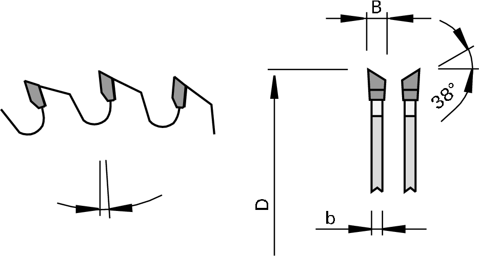 - Zāģēšana bez šķembām, neizmantojot griešanas iekārtu, pateicoties 38° šķērsleņķa zobam