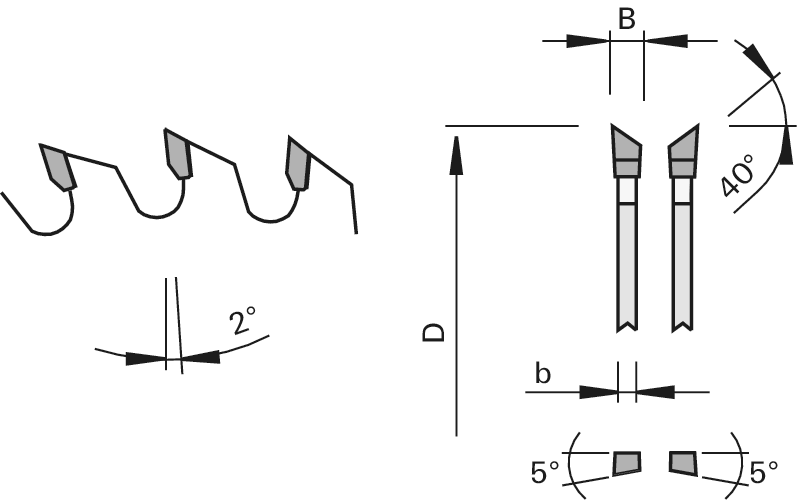 Zobu forma: Rotējošs/ mainīgi slīps zobs ar “WSA” aksiālajiem leņķiem